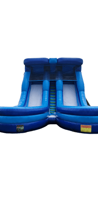 Blue Drop Double Lane Water Slide (20x20) Take the plunge with the Blue Drop Double Lane Water Slide! Measuring 20x20, this vibrant blue inflatable offers two racing lanes for double the fun. Kids and teens can compete to see who splashes down first, making it a top pick for birthdays, school events, and backyard summer parties.